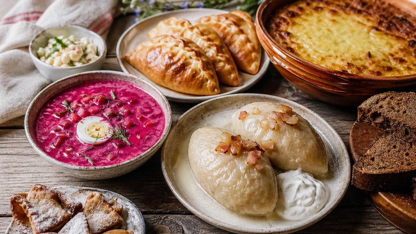 The substantial Litvak Jewish community contributed kugelis (kugel), parts of the rye-bread tradition and the Vilnius cold-fish-and-herring style. Each of the ten dishes above carries the fingerprints of one or more of these streams - and each comes with its own dedicated guide explaining where it sits in the broader story.
